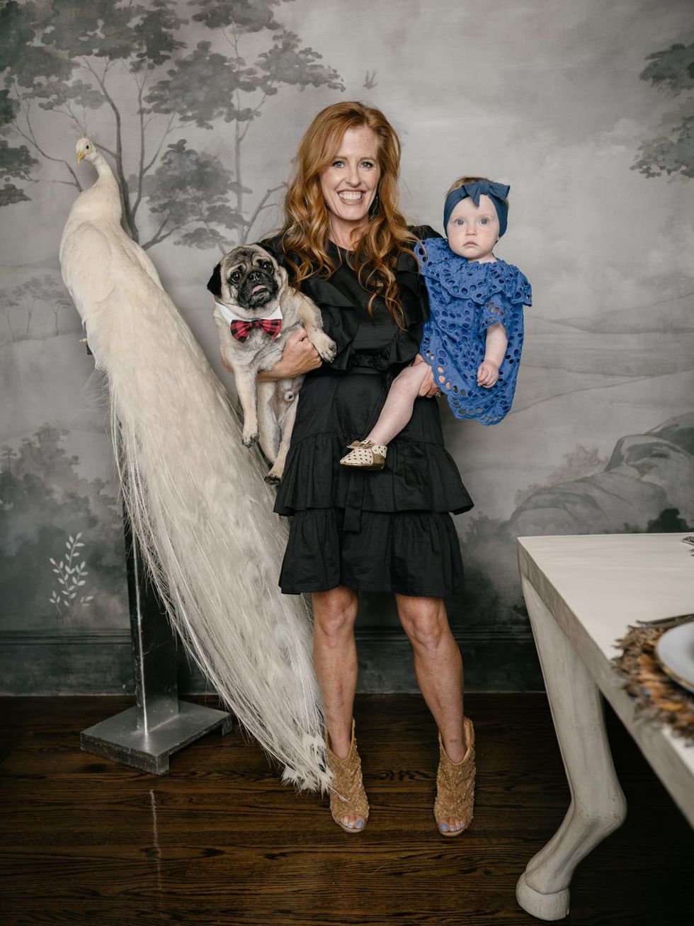Caroline Lizarraga at home in front of one of her hand-painted walls, along with her pup Magellan and her daughter, who she affectionately calls Peach. (Christopher Stark)